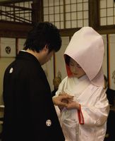 神前にて指輪を受け取り、最初は新婦様から新郎様へ、次に新郎様から新婦様へ、それぞれ指輪を左手薬指に贈ります。 |